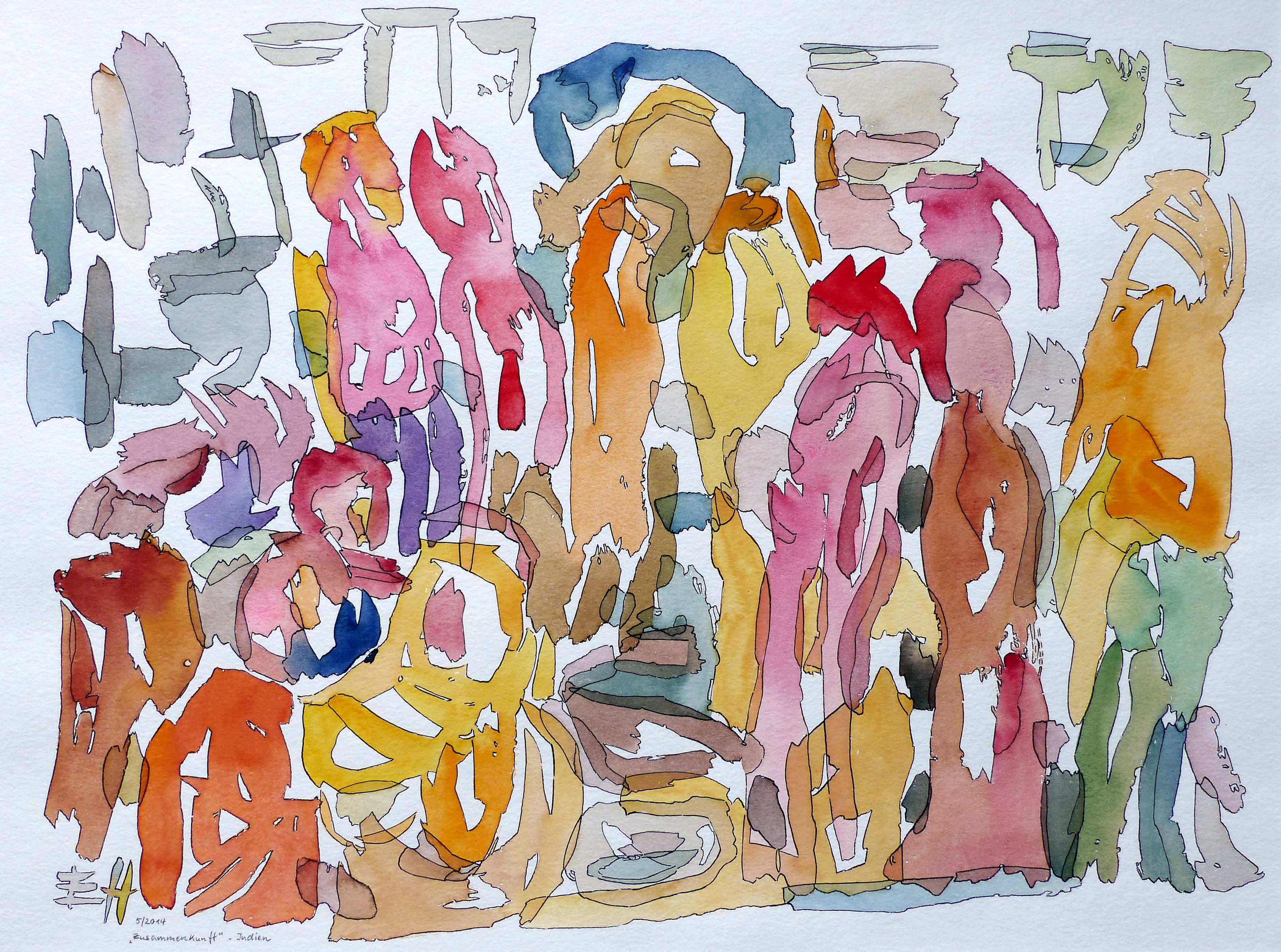 zu erahnen ein Torbogen, Säulen und Fassaden von Häusern, ein Baum … Dieses Bild wurde von Ellen Hauser ursprünglich nicht als Illustration zu unserer biblischen Jahreslosung gemalt. Es hält vielmehr Eindrücke vom Besuch eines Marktes in Indien fest und trägt den Titel ,Zusammenkunft'. Menschen mit je eigener Lebensgeschichte kommen aus verschiedenen Richtungen auf dem Markt zusammen, lassen sich nieder oder bleiben stehen, halten inne oder gehen weiter, sprechen miteinander oder grüßen einander nur knapp, bilden
