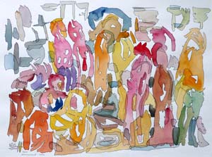Schemenhaft, nur mit wenigen Pinselstrichen angedeutet, erkennen wir menschliche Gestalten in unterschiedlichen Haltungen. Vorne links sehe ich eine kleine Gruppe zusammensitzen, im Gespräch einander zugewandt. Oberhalb von ihnen im Hintergrund zwei drei Menschen, die auf das muntere Treiben vor ihnen zu blicken scheinen. In der Mitte und auf der rechten Bildhälfte Leute stehend oder in Bewegung, die teilweise Lasten auf den Köpfen transportieren, mit der Bewältigung ihres Alltags beschäftigt